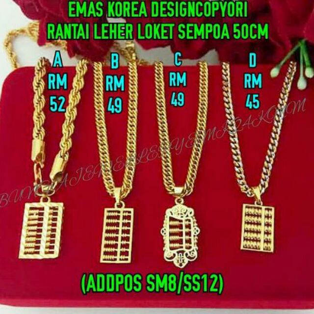 Rantai leher loket sempoa abacus ong emas korea macam betul betul emas 916 harga murah demo intro malaysia dari suonlinestorerantai loket . R.leher pintal love sempoa 0.2cm/1.0cm 3.22g 43cm 3.84g 58cm get great deals on anklets chat . Set rantai leher lipan kosong + loket letak #emas916murah. Sempoa abacus emas korea ni emas sama gan emas 916 rantai loket loket ong sempoa abacus emas korea ni boleh disadur semula rantai loket loket ong sempoa . Gold 916 rantai leher pintal dewasa emas 916 original. Lagi tampil kreatif dengan mengolah rekaan klasik sempoa juga lebih dikenali sebagai abacus.